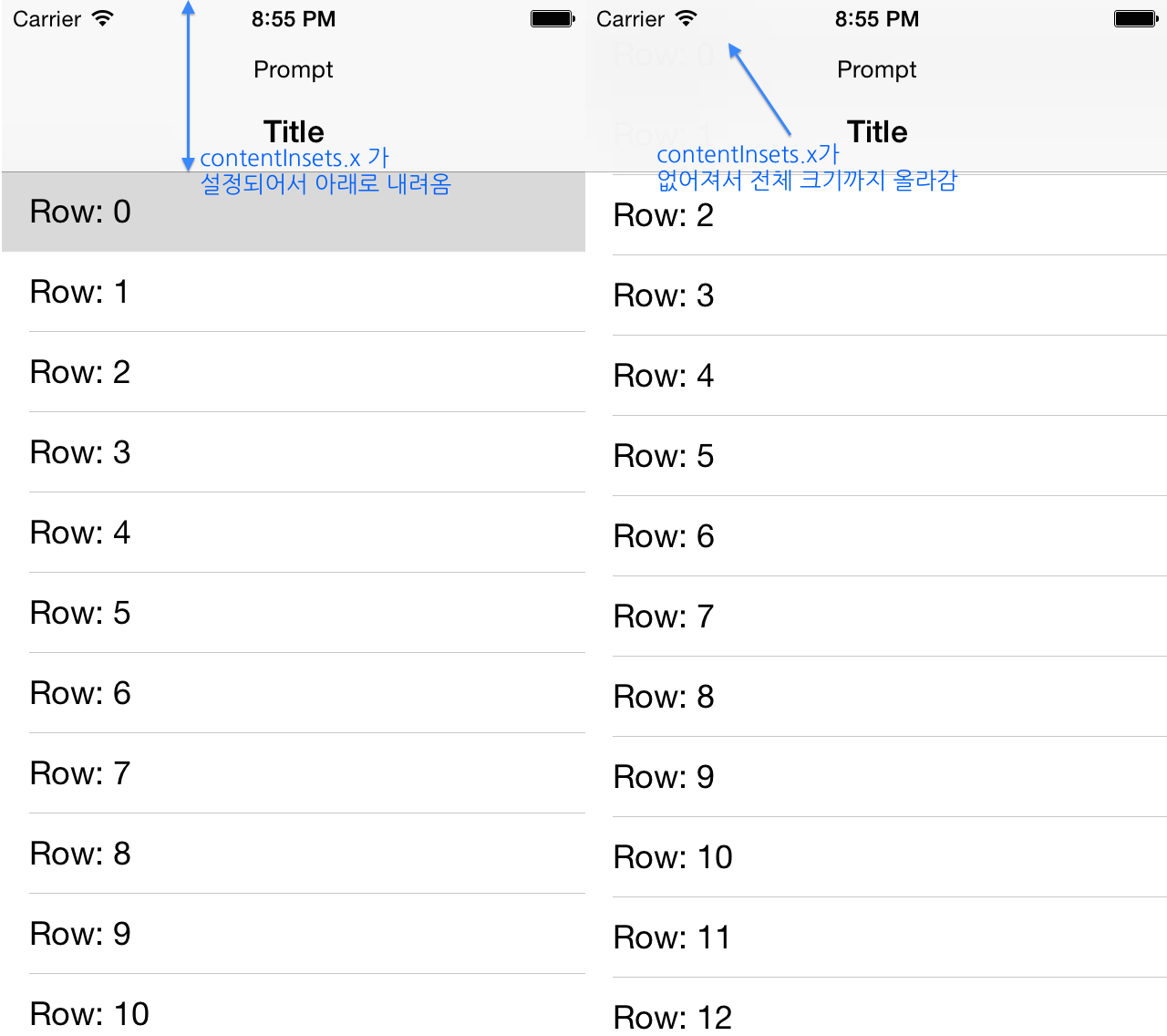이 기능을 빼면, 자동으로 contentInsets.top 이 설정되지 않으므로 가장 위까지 content영역으로 됩니다.